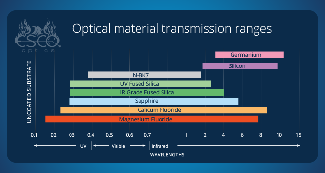 材料有许多不同的形式,有数百种为可见光谱制造的光学玻璃。其他,如熔融石英, 扩大了传输范围,延伸到紫外线和近红外线深处。然后是基于晶体的材料,例如硅和锗,它们在可见光中根本不透射,但对红外光是透明的。一些晶体,如 CaF2(氟化钙)和 MgF2(氟化镁)具有从紫外线一直到长波红外光的出色透射率。另一组材料是吸收性滤光玻璃,可以选择性地传输某些波长而阻挡其他波长。下图是一些常见的材料传输范围:
